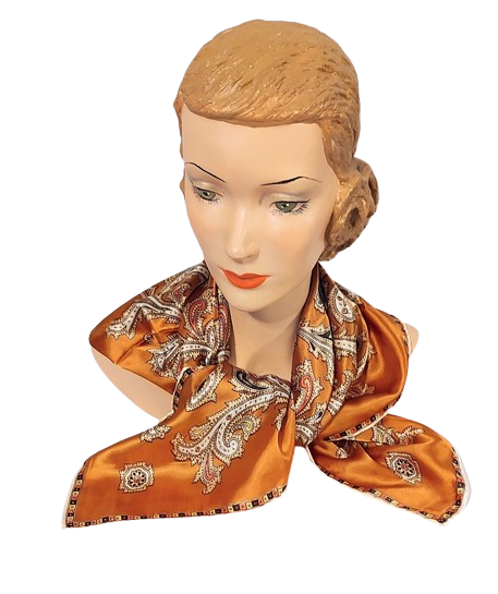 A large 1950s vintage orange, brown and white paisley patterned silky scarf with a border design.